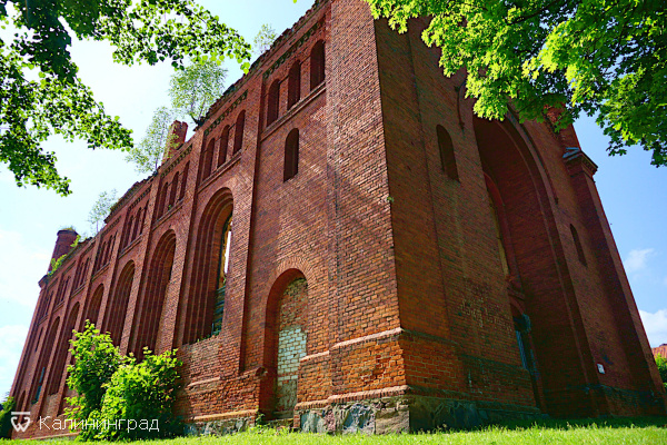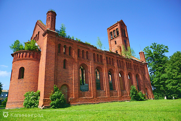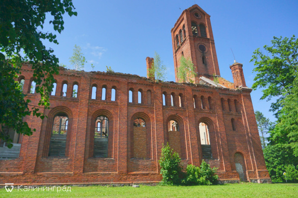 Несмотря на то, что кирха фактически заброшена, она смотрится очень царственно. Красный кирпич очень эффектно сочетается с ярким зеленым газоном, ступени и вход выглядят очень монументально.