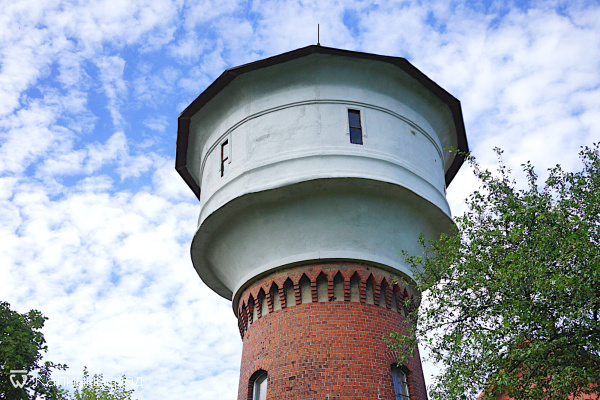 Внешне башня напоминает гриб: расширенная верхняя часть – резервуар для хранения воды, и более узкая нижняя часть, поднимающая резервуар на нужную высоту. Нижняя часть цилиндрической формы, расширяющаяся немного к фундаменту, выложена из красного кирпича, имеет входы и зарешётчатые окна. Кладка узорчатая, особенно красива в верхней части. На крыше установлен шпиль, выполнявший роль молниеотвода. Башня неплохо сохранилась после штурма города.