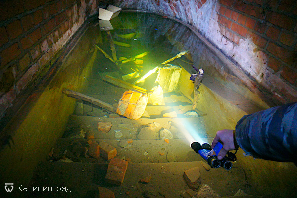 Большое впечатление произвело затопленное подвальное помещение – вода сюда пришла из колодца. Она настолько прозрачна и неподвижна, что едва различима.