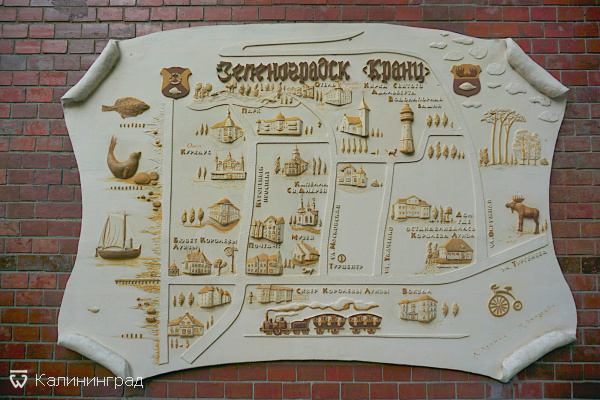 Если обойти здание с внешней стороны, двигаясь от Курортного проспекта, то можно увидеть барельеф "Карта Зеленоградска", которая "висит" на стене здания.