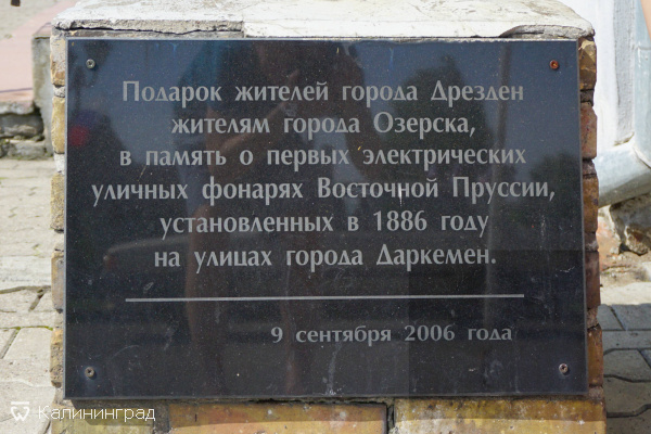 Уже в наше время немецкий город Дрезден передал в дар Озерску памятник первому фонарю, который был торжественно открыт 9 сентября 2006 г. На постаменте памятника установлена памятная доска с надписью: "Подарок жителей города Дрезден жителям города Озерска, в память о первых электрических уличных фонарях Восточной Пруссии, установленных в 1886 году на улицах города Даркемен".";s:4:"TYPE";s:4:"HTML";}