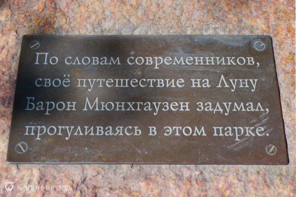 Подпись к скульптуре сообщает: "По словам современников свое путешествие на Луну Барон Мюнхгаузен задумал, прогуливаясь в этом парке". И это вполне возможно, учитывая, что реальный Мюнхгаузен заезжал в
