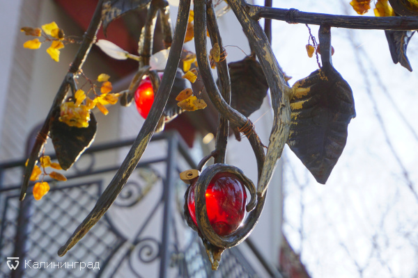 Светлогорска. Кованое дерево с янтарными элементами установлено на валуне, к которому прикреплена стилизованная табличка с историей происхождения яблони.