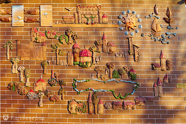 На здании ювелирного магазина "Золото Кёнигсберга" на ул. Октярбьская можно увидеть рекламу магазина – казалось бы, ничего интересного. Но по обе стороны от рекламного объявления, находится две карты в виде барельефов.