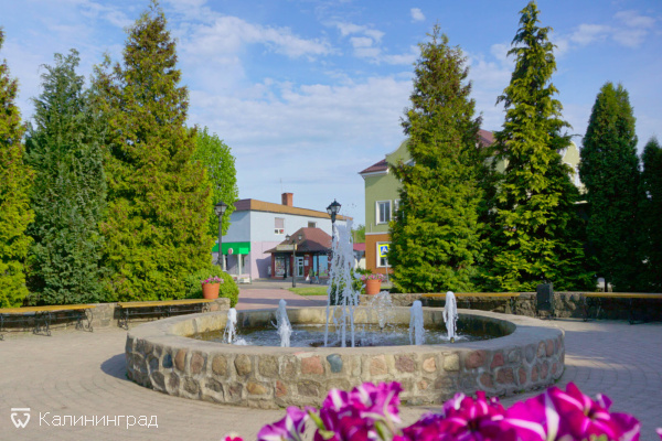 Небольшая аккуратная площадь больше напоминает сквер. Вокруг фонтана установлены скамейки и урны, высажена зелень и цветы. Картину дополняют ажурные фонари.