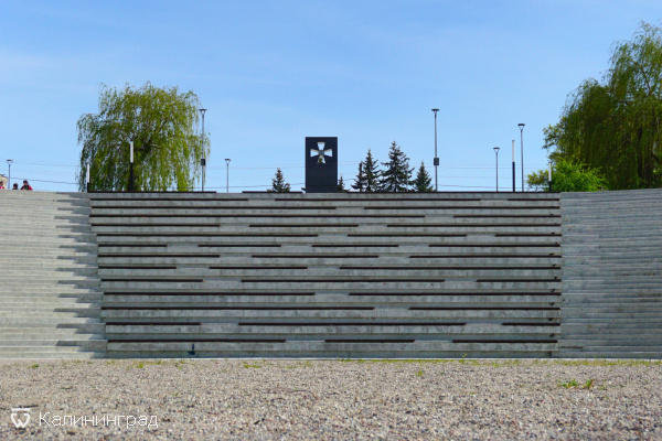 Вокруг креста расходятся круги цвета георгиевской ленты, что особенно эффектно смотрится с башни церкви. От памятника идет лестница на набережную Мельничного пруда. Соответственно, подойти к нему можно как со стороны храма, так и со стороны набережной.