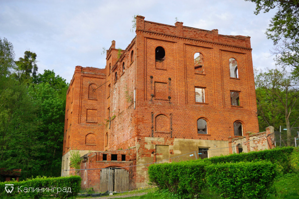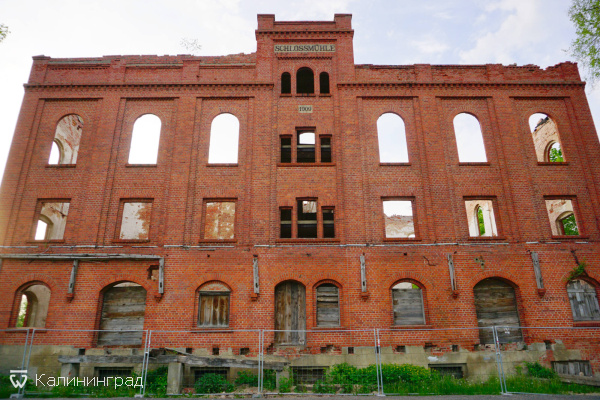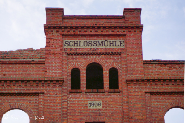 Мы были здесь летом 2022 г. Сильных разрушений нет, здание выглядит вполне целостно. На фасаде сохранилась надпись "Schlossmühle", что в переводе с немецкого означает "Замковая мельница", и дата основания – "1909".