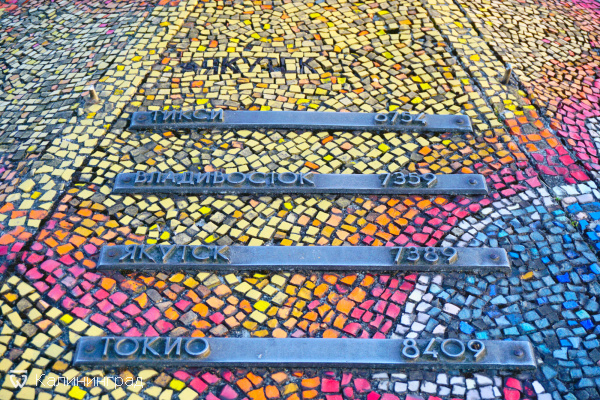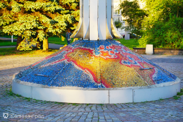 На постаменте мозаикой выложена карта мира, где показано расстояние от разных городов до