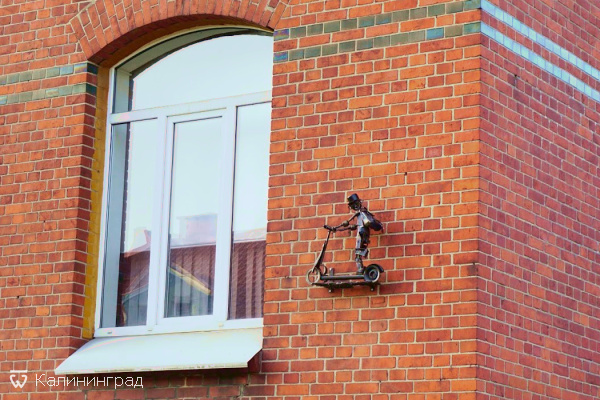 На этой же стороне здания можно увидеть небольшую металлическую скульптуру, которая изображает подростка на самокате. Это работа местного мастера-художника по металлу, чьи творения встречаются в Гвардейске на каждом туристическом шагу. В городе есть небезызвестная
