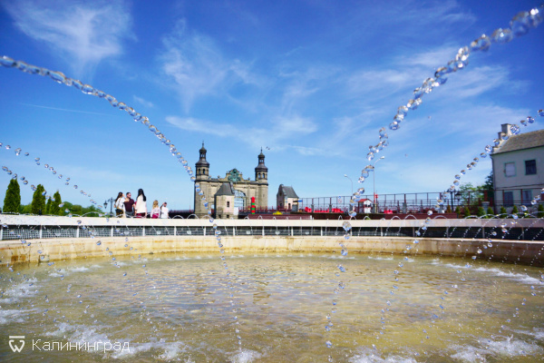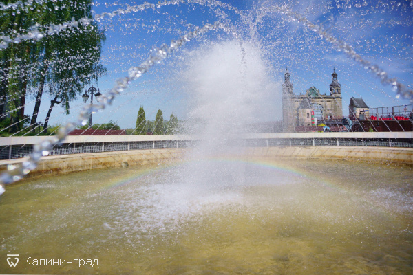 Когда мы вернулись сюда повторно – фонтан уже работал. Было тепло, солнечно и красиво! Сквозь струи – которые то опускаются и еле журчат, то поднимаются и шумят, как настоящий водопад – виднеется Мост королевы Луизы. Брызги освежают, и в них мерцает маленькая радуга. Прекрасное место – просто волшебное ?