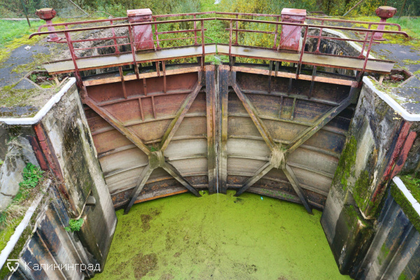 Метал и бетон, из которого был построен шлюз, хорошо сохранились. Сооружение выглядит серьезно и внушительно до сих пор. Экзотично смотрится стоячая вода в камере между воротами – она покрыта салатовой тиной и выглядит так неподвижно, что кажется, там можно ходить.
